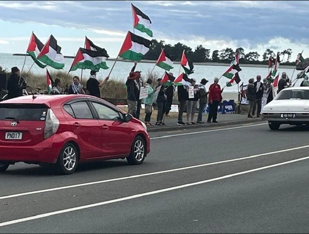Supporters in Whakatū/Nelson flag-waving last weekend – huge motorist support for Palestine
