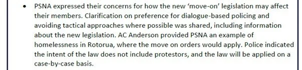 We also raised the issue of so-called “move-on” orders and in response were told “the intent of the law does not include protestors”. Here is a snip from the police minutes of the meeting.